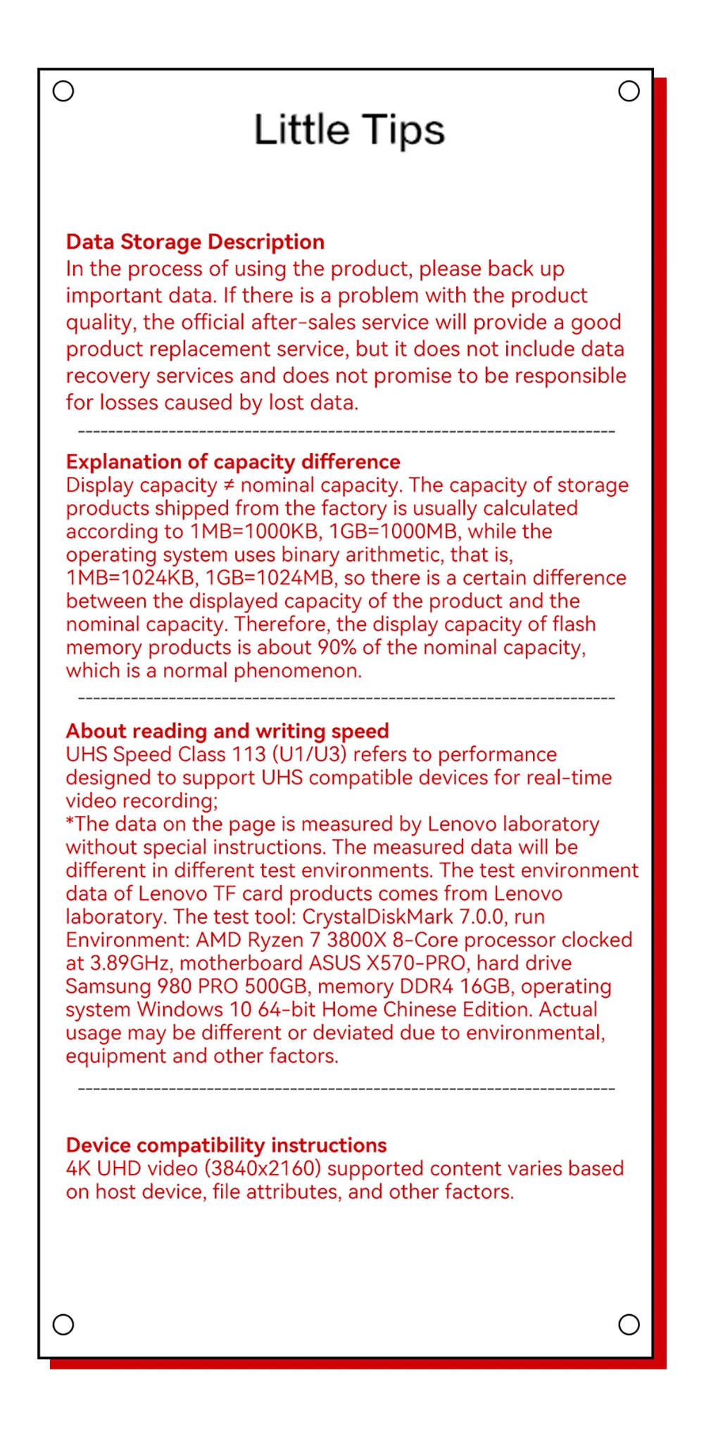 Storage Security: Back up important data regularly in case the card is damaged or lost. Also, ensure that the storage environment is not exposed to extreme temperatures or humidity to extend the life of the card.