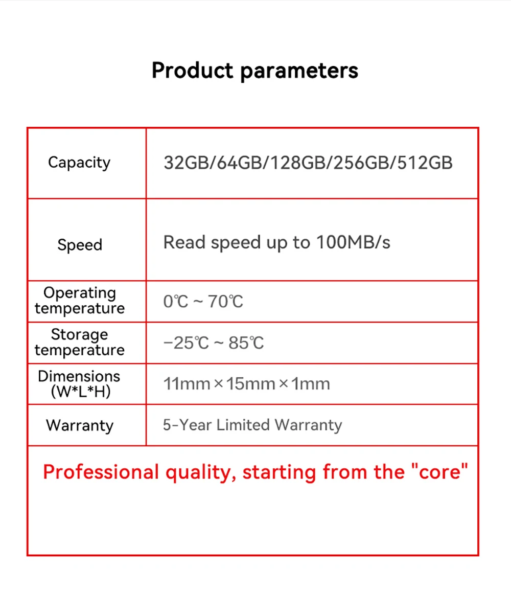 The reading speed is as high as 100MB/s, which greatly saves the time for transmitting high-precision images and 4K high-definition videos. The writing speed is also excellent, allowing you to easily capture high-speed sports photos and 4K high-definition videos.